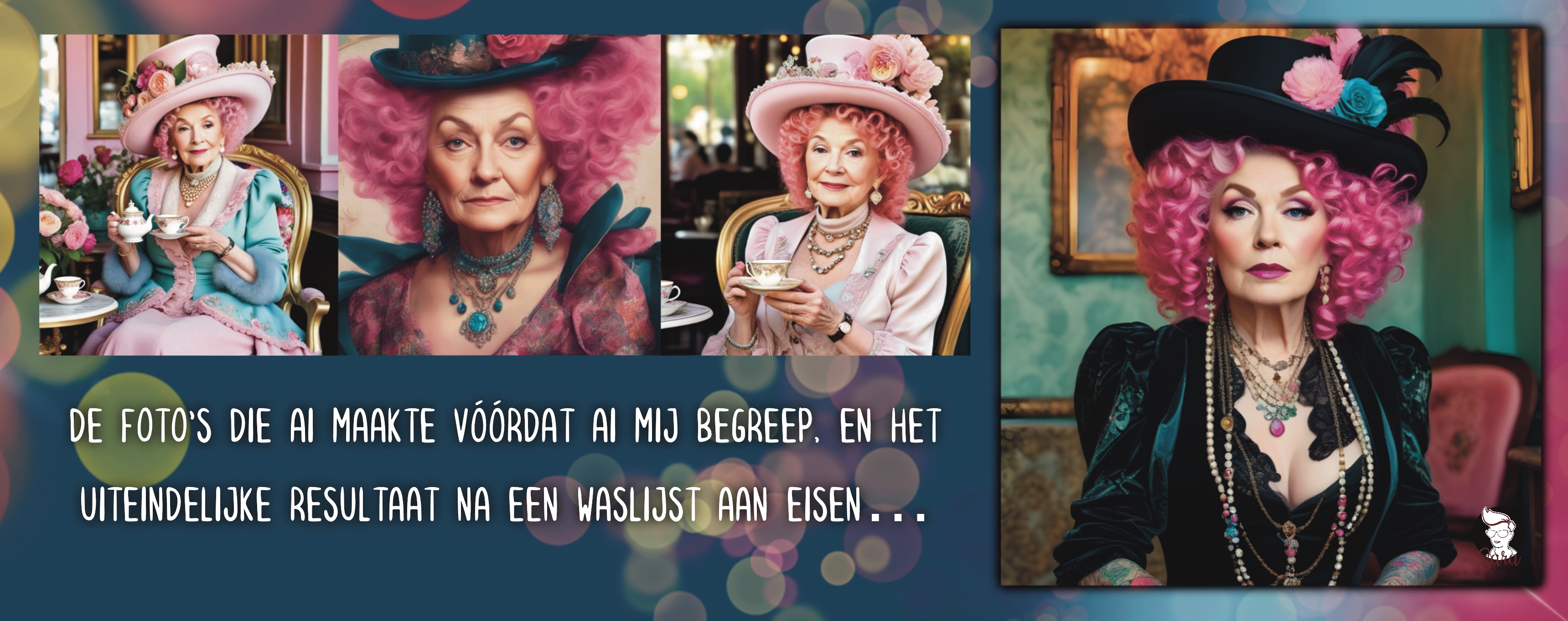 Er zijn verschillende soorten Ai die niet tekst maar beeldmateriaal produceren. Dan kan je als leek bijvoorbeeld zeggen dat je een foto van een oude vrouw wil. En je vertelt de Ai in welke stijl,  met welk kleurenpalet, en aan welke eisen de foto allemaal moet voldoen … Zo heb ik een half a4-tje aan eisen ingevoerd om een foto van een wat oudere vrouw te genereren met roze krullen, in victoriaanse stijl, enz … maar het was echt even aanpoten voor er een foto uit kwam rollen die aan mijn eisen voldeed. Want voor Ai begreep wat ik wilde … het werken met Ai vond ik al een kunst op zich 🙂
