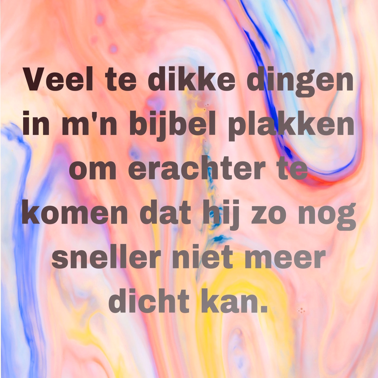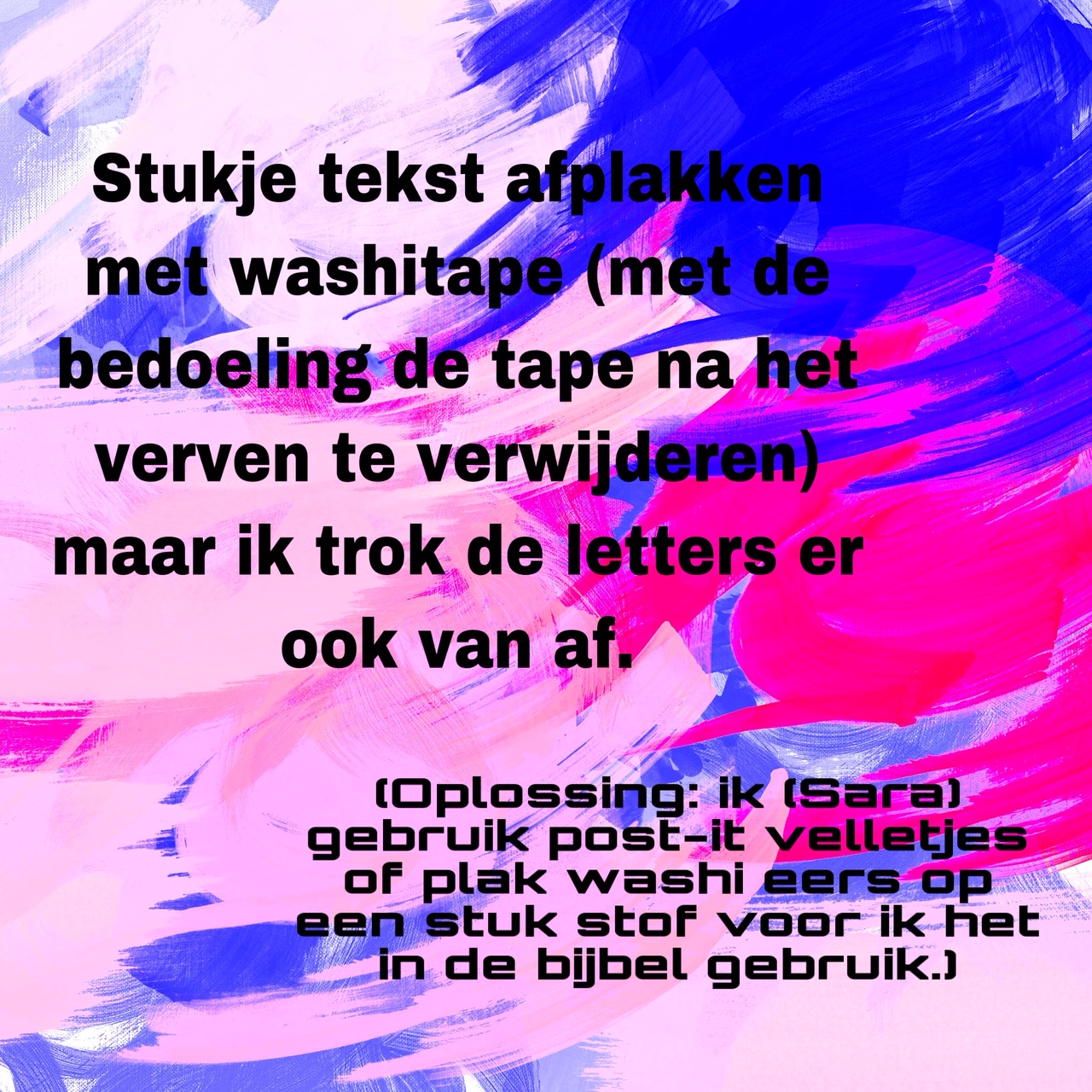 Er zijn geen échte fouten. Laten we daarmee beginnen. Want het gaat niet om het resultaat maar om het feit dat je tijd in de bijbel met je hemelse Vader doorbrengt. Dus ‘fouten’maken mag. Toch wil je ook wel een mooi resultaat. De één wil persé de bijbeltekst leesbaar houden en een ander denkt ‘Ik lees wel in een andere bijbel, in deze wil ik me kunnen uiten.’ ..