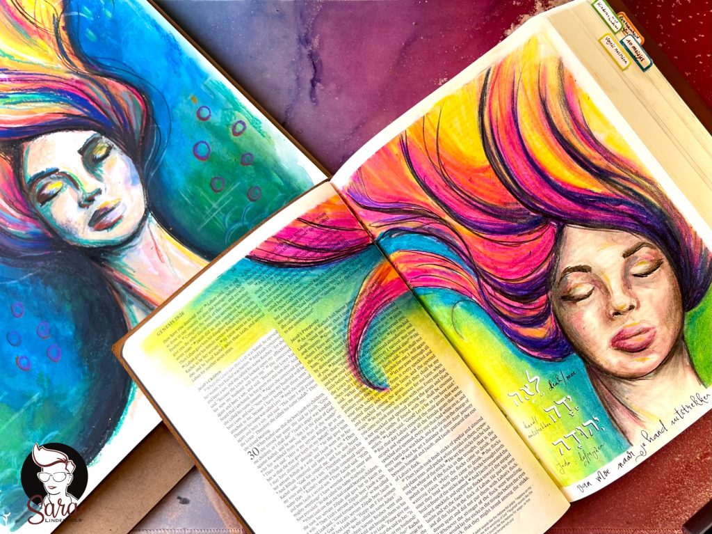 Dit meisje met gesloten ogen, ik noem haar Sophia, werk ik in deze les uit in verschillende stijlen: als kleurrijke (bible) artjournal-pagina én als portret op los papier. Zo ontdek je hoe tekenen een verhaal kan vertellen; ook zonder woorden.