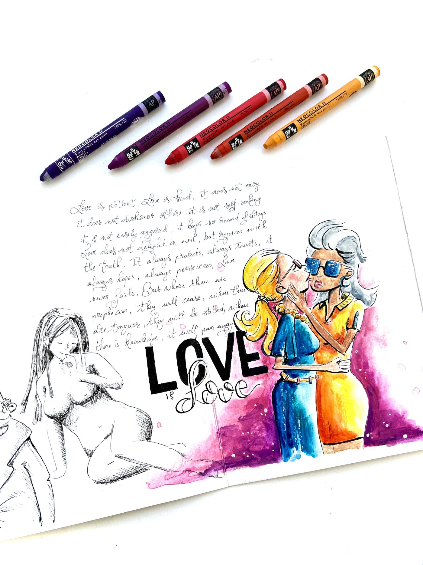 4. Regel van 3. Always. Ik heb het al zo vaak genoemd. Vergeet bij je kleurkeuze niet de regel van 3: gebruik van 1 kleur altijd meerdere tinten. Dat maakt je tekening zoveel interessanter. Kijk, bij mijn snorremansen hierboven heb ik dat ook gedaan. Ik koos voor een triadisch palet maar van elke kleur dan wel 3 tinten. Dan lijkt het alsof je heel veel kleuren gebruikt maar er zit toch eenheid in! En hieronder, mijn reisverslag van afgelopen februari …blauwgroen / rozerood en zanderig oranje-geel; een split-complementair kleurpalet. Dat zit tussen een triadisch en een complementair palet in.