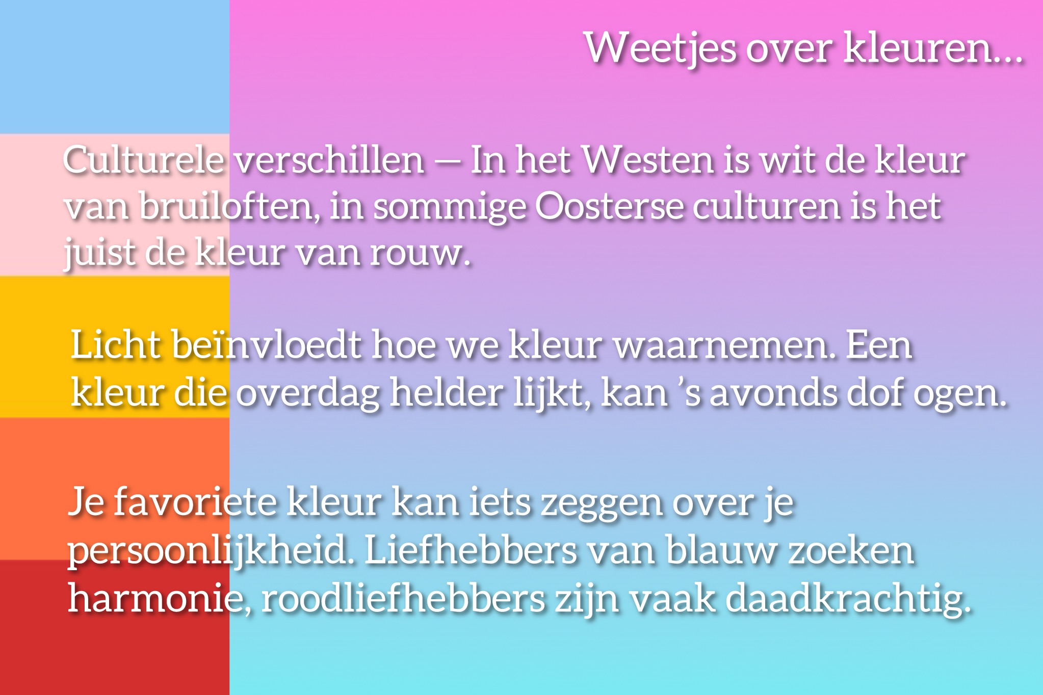 | Als ik zeg: “Ik voel me geel!” klinkt dat misschien een beetje gek. Maar toch — welk gevoel roept dat bij je op? Grote kans dat je denkt aan blij, vrolijk, opgewekt. En wat als ik zeg: “Lichtgroen?” Dan denk je misschien aan fris, levendig, nieuwsgierig. Maar bij “een waas van blauw met een vleugje zwart” voel je waarschijnlijk iets heel anders. Verdrietig misschien. Of vermoeid. Misschien zelfs een tikje somber.n Natuurlijk kan iedereen er andere woorden aan geven. Maar je voelt wél wat ik bedoel, toch? Kleuren zeggen wat woorden soms niet kunnen. En dat is precies waarom creativiteit zo helend is. Het is een taal van voelen, niet van uitleggen. De kleuren die jij het mooiste vindt, het meest kiest qua kleding of in je tekeningen … dat zegt iets over je …Tot nu toe koos ik kleur meestal puur intuïtief. In de periode dat ik net moeder werd, leefde ik (onbewust) in warm rood. Mijn haar, mijn kleding, zelfs mijn keuken: rood. En tijdens een zware depressie verdween dat rood. Alles werd zwart. Ja, ook mijn haar. Maar dat is het mooie van kleur: het groeit met je mee. Of eigenlijk… het wéérspiegelt je. ![]() Wat veel mensen niet weten, is dat kleur niet alleen iets over je zegt; het beïnvloedt ook hoe je je voelt. Bedrijven weten dat al lang. Rood en geel, bijvoorbeeld: de kleuren van haast alle fastfoodketens. Geel trekt de aandacht, geeft je een vrolijke vibe. Rood verhoogt je hartslag en zet aan tot actie. Resultaat? Snel kiezen, hap toe. (Pun intended.) En er is zelfs een voetbalstadion dat de kleedkamers van de tegenpartij zachtroze verfde, gewoon, om ze een beetje tammer het veld op te sturen. En in de jaren 70 werd al ontdekt dat roze een kalmerend effect kan hebben op het brein. Sommige gevangenissen kleurden toen zelfs hun muren roze. Kleuren raken je dus. Onbewust, of juist heel bewust. Zo had ik de laatste tijd, de neiging om me weer helemaal in het zwart te hullen. Maar ik besloot: niet alleen zwart. Ik weet wat kleur kan doen en ik draai het nu om: ik wil kleur inzetten om mezelf te dwingen positief te blijven. Maar ik wil mijn gevoel ook niet ontkennen. Dus combineer ik het bewust met fuchsia en koningsblauw. Fuchsia is voor mij de kleur van durven dromen, van durven stralen. Het zegt: hier ben ik – ik wijk niet. En blauw? Blauw herinnert me aan (zelf)vertrouwen. Aan helderheid. Aan ademhalen. En dat had ik de laatste tijd even nodig. Bedenk wel: er zijn boeken vol geschreven over de betekenis van kleur. Maar alsnog kan dit per persoon afwijken. Zie het zo: de gemiddelde kledingmaat voor vrouwen in Nederland is 40-42. Maar er zijn zat dames die veel slanker zijn en er zijn er zat die veel gevulder zijn. En zoals dat de Italiaanse maatjes soms flink afwijken van de Nederlandse of Amerikaanse maten: zo kan de betekenis van een kleur in een andere cultuur heel anders zijn. En sowieso: elke kleur heeft zijn positieve vibe, een neutrale en negatieve vibe. Zo kan je rood als de kleur van passie zien (positief), energie (neutraal) … of zelfs als gevaar of boosheid (negatief)… ![]() Op mijn Instagram zie je een overzicht van wat (globaal) de betekenis is van verschillende kleuren. (Klik hier). |